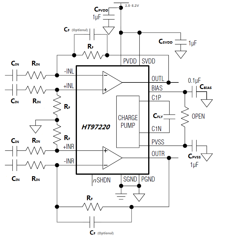 HT97220是一款差分輸入/單端輸入、可直接輸出驅(qū)動(dòng)的耳機(jī)放大器/線路驅(qū)動(dòng)器。5V供電時(shí),器件可為32ohm耳機(jī)提供125mW的功率。器件可通過(guò)外部電阻調(diào)節(jié)增益(固定增益6dB版本需要提前定制)。器件在音頻范圍內(nèi)具有卓越的THD+N表現(xiàn)。